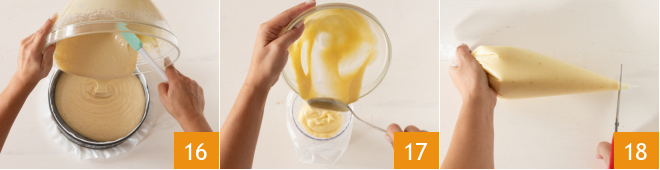 Pour the batter into a 9-inch springform pan, previously buttered and floured or lined with parchment paper 16; smooth it out with a spatula if necessary. At this point, take the already completely cooled cream and place it in a piping bag 17 without a nozzle 18.