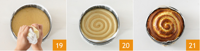 Create a spiral on top of the batter 19 starting from the center of the cake 20. Bake in the oven at 350°F for about 35-40 minutes. Once baked, take out your swirl cake and let it cool slightly before serving 21!