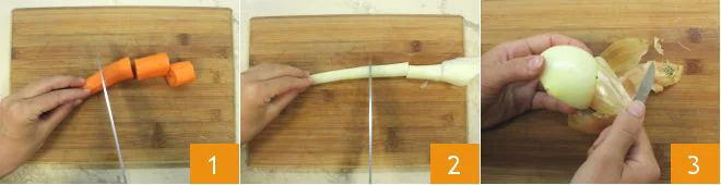 To prepare the lamb tagine with plums and almonds with aromatic couscous, start with the vegetable broth: fill a large pot with water, salt it, and bring it to a boil, then peel the carrots with a vegetable peeler and cut them into pieces 1. Continue by peeling the celery stalk and cutting it into pieces 2. Then peel an onion 3 and cut it into quarters.