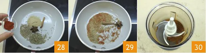 Finally add the chili powder 28 and toast over high heat for about 2 minutes, just enough time for the spices to release their aromas 29. Then let the spice mix cool and transfer it to a mixer, blend for a few seconds 30 and set aside.