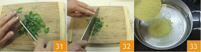 Now prepare the fresh spice mince: rinse the fresh parsley under running water and chop it finely 31, do the same with the mint leaves, wash and chop them 32. Then butter a large, high-sided pot and pour in the pre-cooked couscous 33, spreading it out so it doesn't overlap too much.
