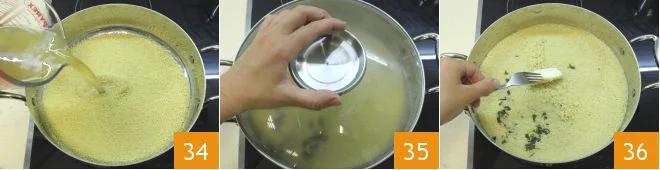 Gradually add about 1 1/4 cups of broth 34, stirring with a fork. Cover and let it rest for 10 minutes, until it swells 35. After this time, add 1 1/2 tbsps of butter and fluff the couscous with the tines of a fork 36.