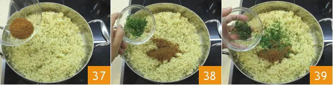 Pour in the ground spice mix 37, the chopped parsley, and mint (38-39).