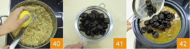 Grate the zest of a lemon 40 and mix well to combine everything. Let the couscous rest covered until the tagine is ready to be served. Now drain the plums from the orange juice using a colander 41 and add them to the lamb 42.