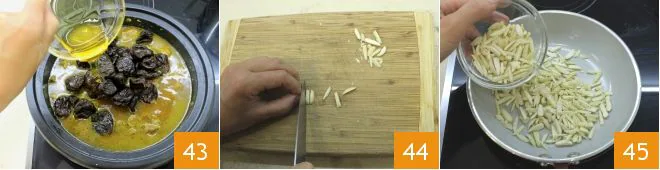 Add the wildflower honey 43, which enhances the sweet and sour note, and let it cook for another 20 minutes. Alternatively, you can substitute the honey with brown sugar. Meanwhile, place the whole peeled almonds on a cutting board and slice them into slivers 44, then transfer the almond slivers to a non-stick pan 45 and toast them over moderate heat until they are golden, being careful not to burn them.