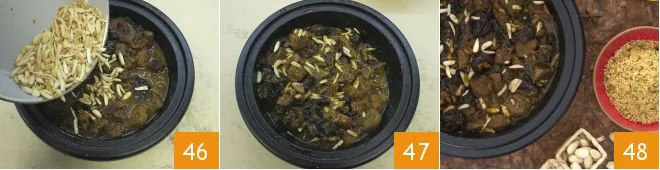 At this point, add the almonds to the lamb, plums, and spice mixture 46 and stir to combine everything 47. All that remains is to immediately serve the lamb tagine with plums and almonds accompanied by the aromatic couscous 48!