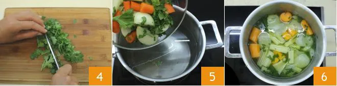 Rinse a bunch of fresh coriander under running water, place it on a cutting board and chop it 4, alternatively, you can also use dried coriander. At this point, add the chopped vegetables and fresh coriander to the boiling water 5 and let it cook on low heat for at least 20-30 minutes 6. Let the broth simmer, allowing the vegetables to cook slowly and release their flavor.