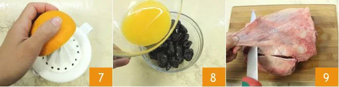 Meanwhile, squeeze the oranges 7 and pour the juice over the plums for the lamb tagine 8. Let the plums marinate for about 1 hour, allowing them to rehydrate. The orange juice gives the plums a pleasant tang, but you can also use apple juice or berry juice, as long as it is pulp-free and pairs well with the flavor of the plums. Now focus on cutting the lamb meat: place the lamb leg on a cutting board and remove the fatty parts using a sharp knife 9.