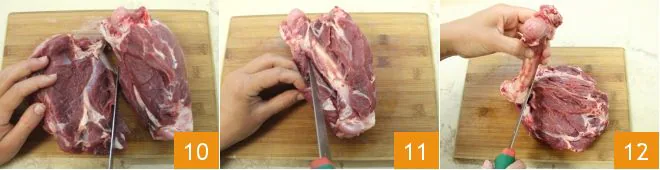 Then divide the leg in half 10 and, still using the knife, carve the meat around the bone 11, until it is completely removed 12.