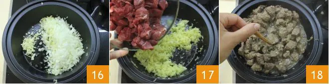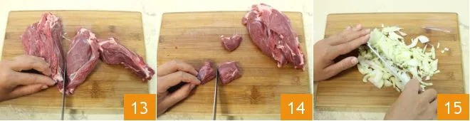 Cut the lamb meat 13 into regular cubes of about 3/4 inch 14 so that the cooking is more uniform. Then peel an onion and chop it along with the two peeled garlic cloves 15.