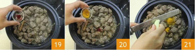 Add the saffron 19, turmeric 20, and finally grate the fresh ginger 21. Mix well and let everything sauté for 5 minutes with the tagine lid on.