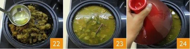 After this time, salt and pepper to taste and pour two ladles of broth 22, which will be ready by now, until the spiced meat is completely covered 23. Cover the tagine with its conical lid 34 and let it cook for about an hour on very low heat.