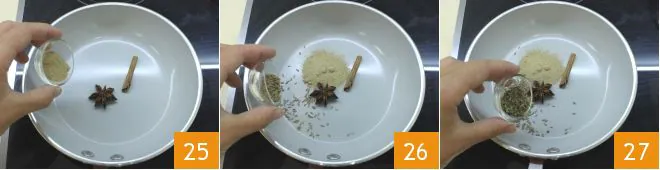 In the meantime, focus on the couscous: start by toasting the dried spice mix. In a non-stick pan, pour the star anise and a cinnamon stick, add the cardamom powder 25, fennel seeds 26, and cumin 27.