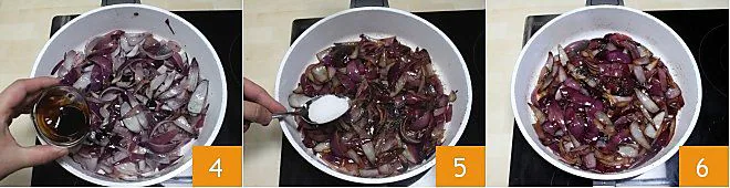 When the red onions start to soften, add the balsamic vinegar 4 and the sugar 5. Salt to taste and let them stew until they reach a soft but not mushy consistency 6.