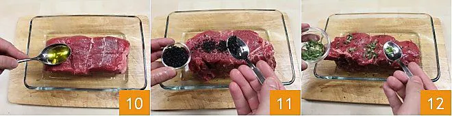 Then transfer the meat to a baking dish and pour the oil over it 10, using your hands to grease the piece well. Sprinkle the meat with Hawaiian black salt 11 and thyme leaves 12.