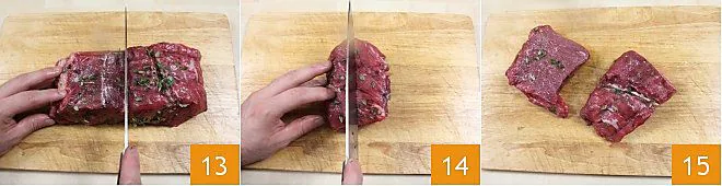 Transfer the flavored meat back to the cutting board and divide it into two 13, then cut each piece in half 14 to obtain 4 steaks 15.