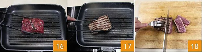 Heat a griddle or non-stick pan very well and sear the steaks on both sides (16-17) to the desired level of doneness. If you prefer the inside to stay pink and not dry, cook for a maximum of 4-5 minutes. Avoid pricking the meat during cooking to prevent its juices from escaping. Once cooked, transfer the steak to a cutting board and cut it diagonally to obtain more precise and compact slices 18.