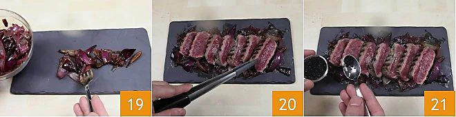 Form a layer of caramelized onions on a serving plate 19 and place the sliced beef on top 20. Garnish with more Hawaiian black salt and thyme leaves 21 and serve your sliced beef with sweet and sour onions immediately!