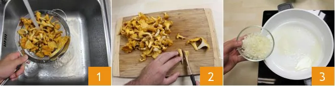 To prepare tagliatelle straw and hay with chanterelle and speck ragù, start with the preparation of the ragù: gently wash the chanterelle mushrooms under running water 1 (it is advisable to do this quickly, as chanterelles absorb water very easily; if they are not too dirty, using a damp cloth will suffice). Drain them very well (if necessary, gently pat them dry with a kitchen towel) and slice them finely 2. Chop the onion and sauté it in butter over low heat for a few minutes 3;