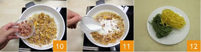 then add it to the ragù being prepared, cooking everything for another 10 minutes or so 10. Toward the end of cooking, add the cream 11, mix well and adjust salt and pepper. Then proceed to prepare the pasta, and serve it on a plate 12