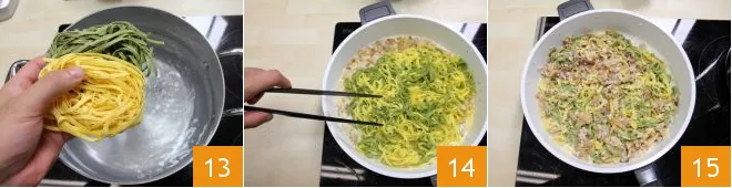 and immerse it in boiling water as soon as the water is boiling 13; when al dente, drain and toss it with the prepared ragù 14 (if it seems too dry, you can soften it with a few tablespoons of cooking water). Tagliatelle straw and hay with chanterelle and speck ragù is ready: serve immediately, garnishing the serving plate with a sprig or a sprinkle of parsley.