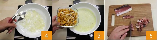 add the crushed garlic 4 and a pinch of salt, this way the onions will release some moisture, then add the chanterelles 5, deglaze with white wine, then cook everything over medium heat for about 15 minutes, or until the wine is fully evaporated. In the meantime, prepare the speck by cutting it into cubes 6