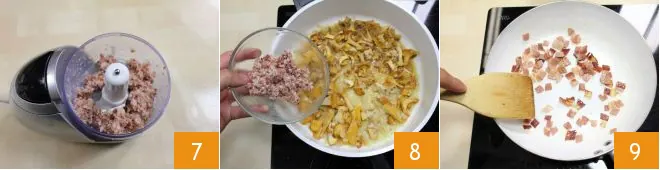 blend half of it with a mixer 7, or a small blender, and add it to the cooking mushrooms 8. In another non-stick pan, sauté the remaining cubed speck to make it crispy 9