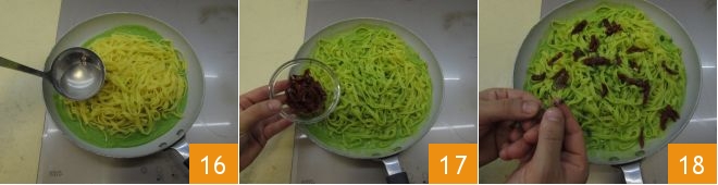 As soon as the water starts to boil, cook the tagliatelle 13. Meanwhile, transfer the pea cream into another pan 14 and once the pasta is cooked, drain it (keeping some of the cooking water aside) and transfer it to the pan 15.