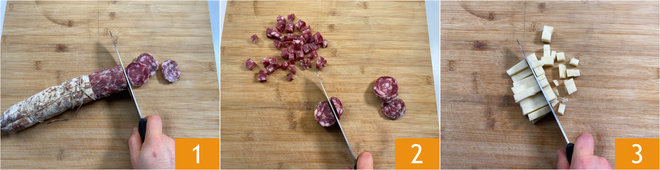 To prepare the tagliolini pie, start with the salami: peel it and first cut it into slices 1 and then into cubes about 0.6 inches 2. Do the same with the provolone 3.