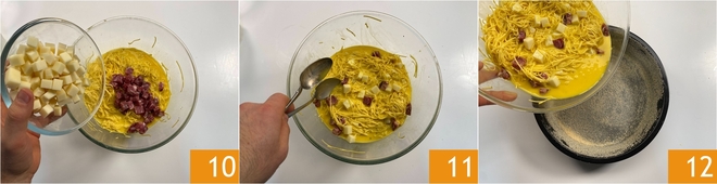 Do the same with the provolone 10. Mix well 11 and pour everything into a buttered pan lined with breadcrumbs 12.