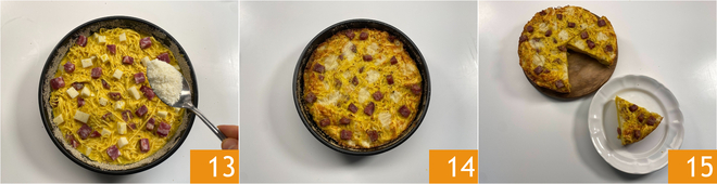 Level the mixture and add the remaining salami and cheese cubes on top. Sprinkle with grated Parmigiano Reggiano DOP 13. Bake in a preheated static oven at 392°F for about 20-30 minutes. If necessary, turn on the grill for a few minutes to further brown the surface. Remove from the oven 14 and serve your tagliolini pie hot or at room temperature 15!