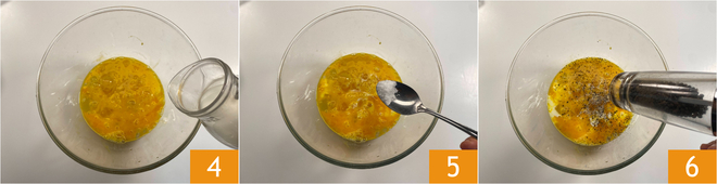 In a bowl, beat the eggs, then add the milk 4, salt 5, and pepper 6.