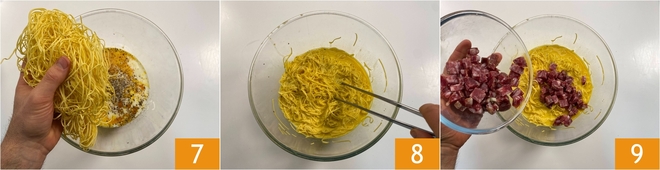 Add the tagliolini 7 and gently mix with tongs 8. Add the cubed salami, reserving a few pieces 9.