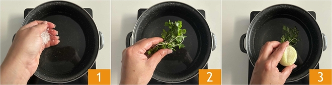 To prepare the takoyaki, start by cooking the octopus: fill a pot with plenty of water, then add a pinch of salt 1, a bunch of parsley 2, and the onion 3.