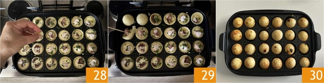 Also distribute the chopped chives and ginger 28. Cook the takoyaki for about 7-8 minutes over high heat, then turn them with the help of a toothpick 29 and cook them for the same time on the other side. If necessary, turn them occasionally until fully golden 30.