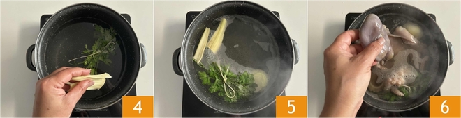 Add the celery 4 and bring to a boil 5. Once the water starts boiling, immerse the octopus and cook it for about 40 minutes 6.