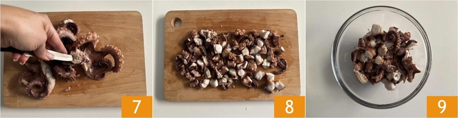 After the octopus is cooked, drain it and remove the beak at the center of the tentacles, if still present 7. Then cut the flesh into pieces 8. Transfer the octopus to a bowl and set aside 10.
