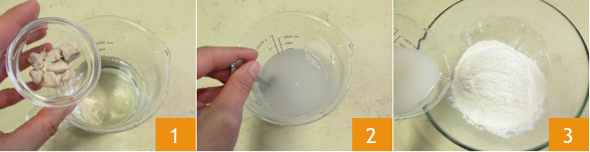 To prepare the tall and fluffy pizza ring, we chose to knead everything by hand, but if you prefer to use a mixer, you can follow the same procedures, using the hook at a medium-low speed. Start by crumbling the yeast into room temperature water 1 and dissolve it well 2, the ideal water temperature is 77°F. Alternatively, you can also crumble the yeast into the flour, the result won't change. If you prefer, you can use 2 g of dry brewer's yeast. Continue by pouring the Manitoba and all-purpose flour into a bowl. Then pour the water a little at a time 3 while kneading with your hands.