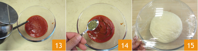 After the rising time, season the tomato sauce with oil 13, salt, and oregano 14. Then take the risen dough 15.