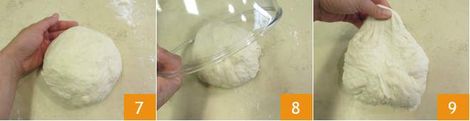 Once you have a nice smooth dough ball 7, let it rest on the work surface for about ten minutes, covering it with the bowl 8. After resting, give it a small fold: imagine the sphere is divided into 4 parts, take the end of each one, pull it gently, and fold it towards the center 9, finally forming it into a sphere.