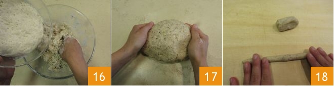 It's time to add the starter dough 16 and knead until you have obtained a smooth and homogeneous dough. Then transfer to a work surface and continue kneading for a few more minutes to blend the ingredients well 17. Now let's form the taralli. Take 70 grams (about 2.5 oz) of dough at a time 18;