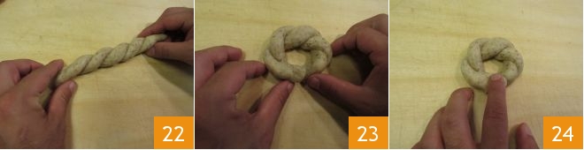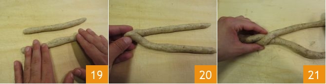 divide it into two pieces of 35 g each (about 1.25 oz) and make two strands 22 cm (about 8.5 inches) long 19. Join the two ends 20 and twist the two strands together 21