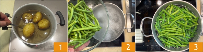 To prepare the taroz, first, boil the potatoes until they are soft; it will take about 30 minutes from when the water starts to boil. Clean the green beans, trim them, and then boil them in water 2 until they are tender, which will take about 10-15 minutes from boiling. Once ready, drain them and quickly plunge them into ice water to keep the color vibrant and stop the cooking.