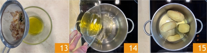 You have now obtained the flavored butter 13. Transfer it to a pan 14 and add the boiled, peeled, whole potatoes 15.