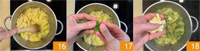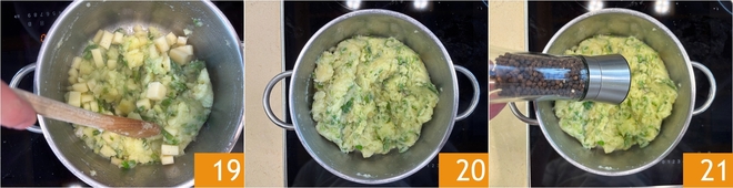 Mash them with a wooden spoon 16. Also, add the hand-broken green beans 17 and begin to mix everything to blend, keeping the heat low. At this point, add the young Casera cheese 18.