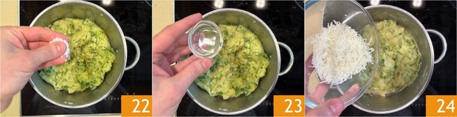 Salt 22, and if it becomes too dry, add a little water 23. Once a thick, creamy puree is obtained, add the grated aged Casera cheese 34.