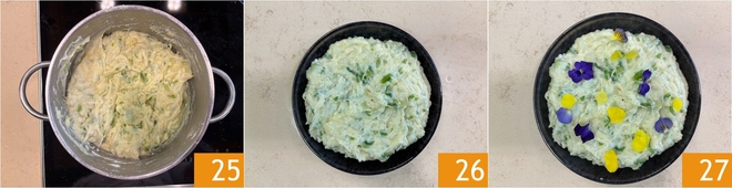 Stir one last time to absorb the cheese 25, then serve the taroz 26 garnishing the plates with edible flowers for a colorful touch 27.
