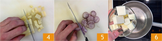 Cut the young Casera into 1/2 inch cubes 4 and grate the aged cheese. Clean and slice the shallot 5. In a small pot, add the cubed butter 6.