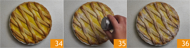 Lay the strips on the custard, first in one direction and then the other, to form diamonds 31, then remove the excess 32. Let the tart rest in the refrigerator for 30 minutes 33.