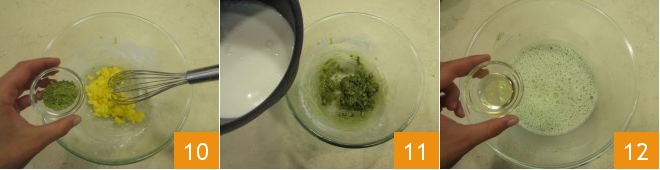 Then add the matcha tea 10 and mix again. As soon as the milk is hot, pour it into the mixture you just prepared 11 and beat with the whisk. Also add the honey 12, mix